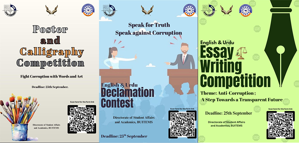 The Directorate of Student Affairs and Academics, BUITEMS, in collaboration with the National Accountability Bureau (NAB), is pleased to announce the following student competitions: Essay Competition (Urdu & English), Poster & Calligraphy Competition, Declamation Contest (Urdu & English) 📌 Submission Deadline: 25th September 2025